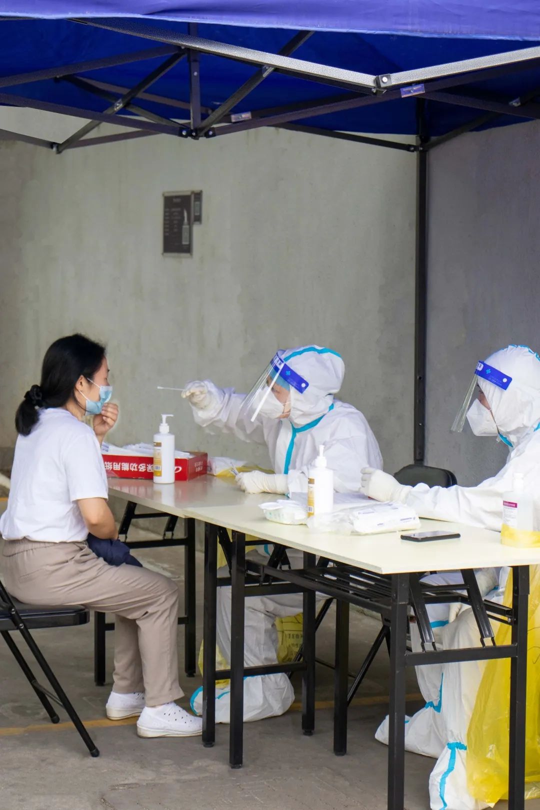 还没走到厂区门口,便能看到志愿者站在路边分发抗原、叮嘱人员扫描场所码,在抗原阴性且有72小时内核酸阴性结果方可进入厂区复工。午餐在分批次的情况下,设定2人/桌,统一面向打饭窗口就坐,减少人员密集,交叉感染的可能性。